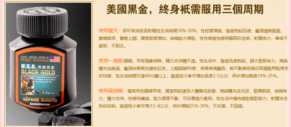• 美國黑金可以在服用半小時內讓你快速勃起,不在是一個軟男子!長期服用更有保養作用: