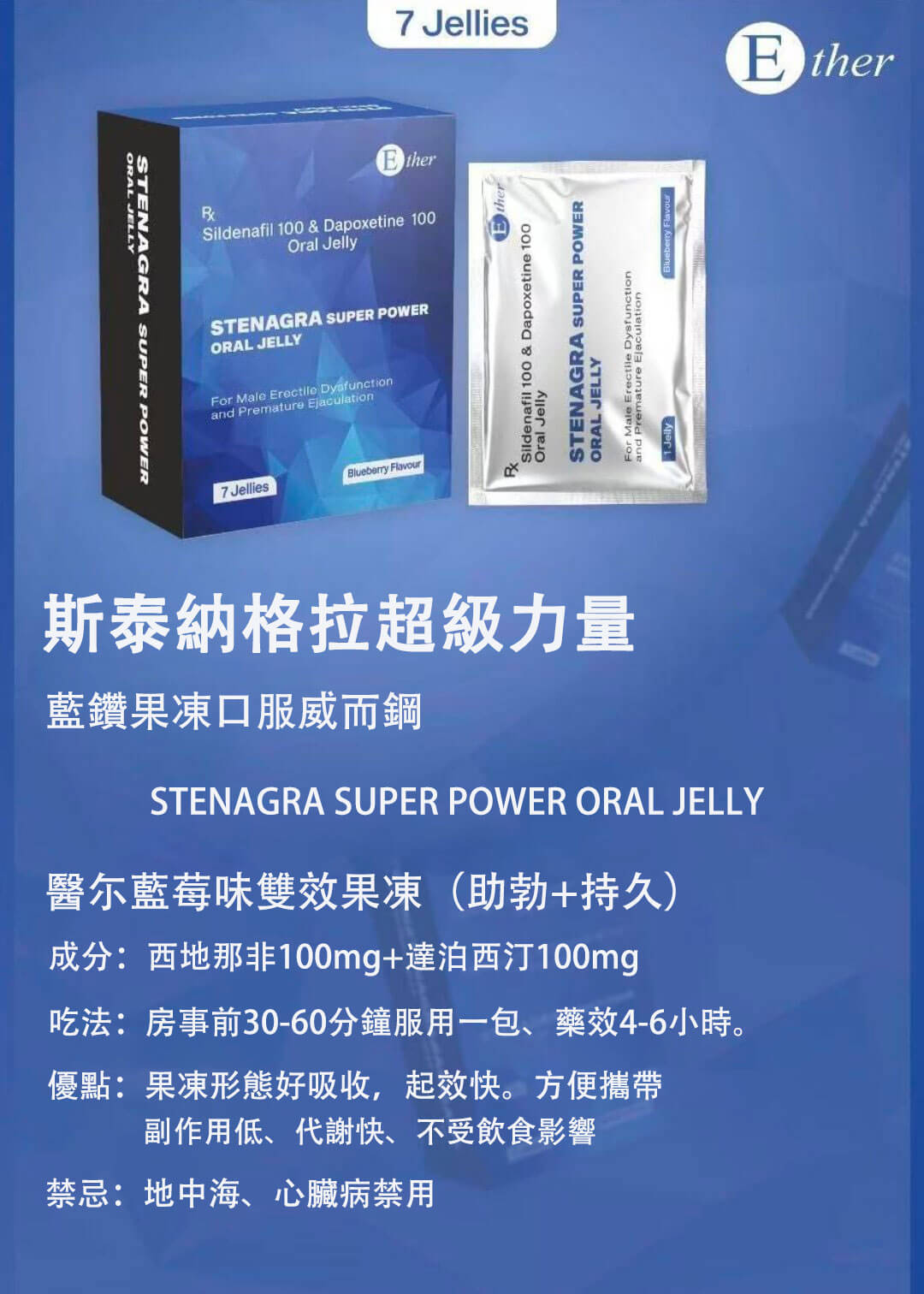 藍鑽果凍威而鋼(STENAGRA SUPER POWER ORAL JELLY)也叫斯泰納格拉果凍威而鋼,是一款專為男性設計的雙效液態果凍威而鋼,結合治療勃起功能障礙(ED)與早洩(PE)兩大功效於一身。由印度知名製藥品牌 Ether 出品,標示為處方用藥(Rx),適合有明確需求並在醫師指導下使用的成年男性族群。